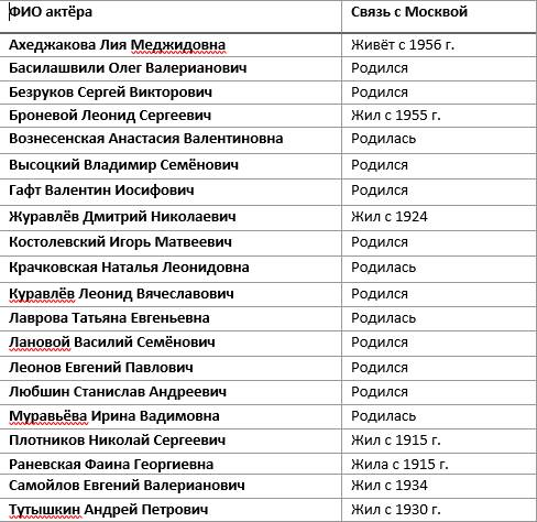 В рамках работы было также проведено исследование на соответствие актёра, у которого было замечено более двух искажений речи, которые соответствуют старомосковским нормам, и его родного города или области, в которой актёр провёл продолжительный период жизни, с Москвой или близлежащими областями. В 65% случаев происхождение актёра действительно совпадало с Москвой или городами, близкими к ней. Ниже приведён список актёров с выявленным в процессе исследования старомосковским произношением, которые родились, жили в Москве или долго работали в московских театрах: