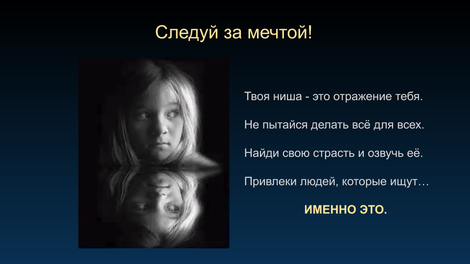 Если вы мыслите слишком широко, и ваша цель звучит как “Я хочу общаться с сотнями клиентов по всему миру”, – то знаете, что? С точки зрения маркетинга, вы должны ПЕРЕБОРОТЬ это своё желание и сузить специализацию до такого уровня, где вы сможете сосредоточить усилия в определённой нише, но зато получите от этого максимальный эффект.