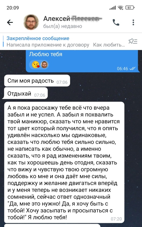 На половину в шутку, а наполовину всерьёз мы составили договор здоровых отношений, взяв за основу тот что я видела на сайте одного психотерапевта, в котором было прописано что важно для нас… Я написала к нему приложение «Как любить Олю» и попросила его написать как мне любить его… Он растерялся… Моё приложение закрепил в переписке в телеграмм и сказал, что он давно уже забыл о том как это, когда его любят, но что я справляюсь и он безмерно счастлив, впервые за последние много лет..