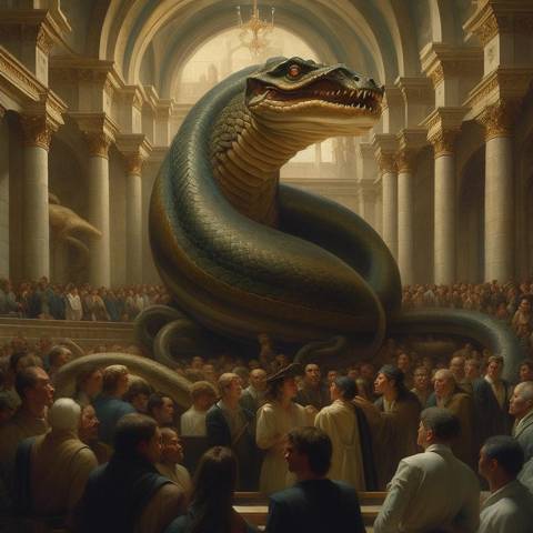Вот, ведь, женщина, нелепое творение Яхве… может перепутала меня с Дьяволом? Он тоже змей… Ведь я даже и не знал, ни про это Древо, ни про её обетования Яхве. А сидел я себе на мшистом камушке среди изумрудных трав на берегу тихого водоёма с прохладной хрустальной водицей, любовался на своё отражение в воде и радовался — ах, какой у меня славный гребень, ровный, мягкий… ах, какие красивые и выразительные глазки. Но, меня, увы, не послушали… а несправедливо обвинили, изгнав… и отъяли телесное бессмертие… и оторвали мои чудесные зелёные ножки… и заставили враждовать с людьми, питаться прахом и ползать на брюхе, как вздорного дождевого червя!