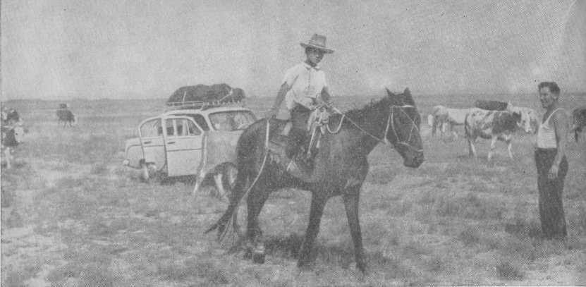 По степи движется длинная гусеница. Да это же поезд! Тепловоз тянет тяжеловесный состав. Подъезжаем к железной дороге. Около переезда — домик обходчика. Обходчик — казах. Два его мальчугана, Вася и Петя, мигом очутились у машины — дорогу показывают, гладят блестящий прут антенны, просят: