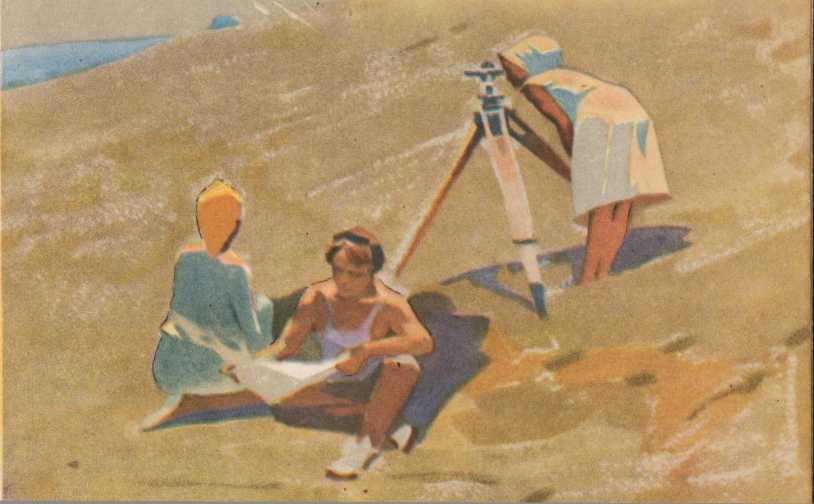 Рукой, темной от загара, молодой геолог быстро рисует на листке блокнота геологический профиль.
