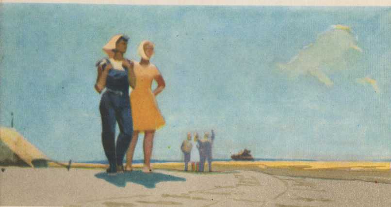 Вот он, старый и мудрый волжский матрос с трубкой, живописные фигуры шоферов, отправляющихся на уборку, и тоненькая девушка в косынке. О чем-то задумалась, склонившись у перил: может быть, жизнь ее на крутом повороте, или она уже держит за крыло синюю птицу счастья…