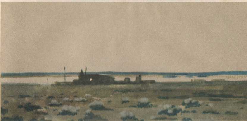 …Долго мы еще слушаем геолога, увлеченного своим подземным миром. Солнце склоняется к западу. Прощаемся с буровиками, нужно еще забрать художника. Он пишет этюд в степи и виден едва заметной точкой на голом горизонте.