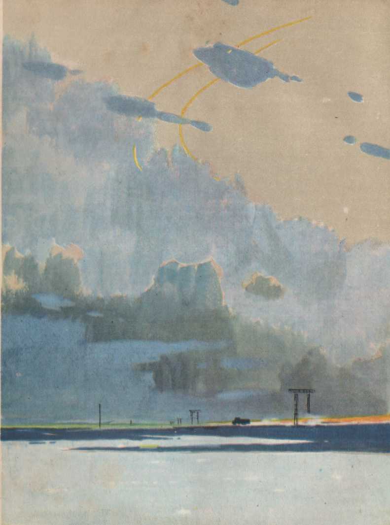 Подъезжаем. Молчаливо разглядываем оживший картон. Первый этюд готов. Раскинулась степь, светится небо, вдали голубеет, как море, уступ древней долины Карамана, на переднем плане степное плато, одинокая полевая Дорога уходит к тонкому силуэту знакомой буровой вышки. Она живет: синеватый дымок вьется над моторным цехом, блестит далекий огонек электросварки.