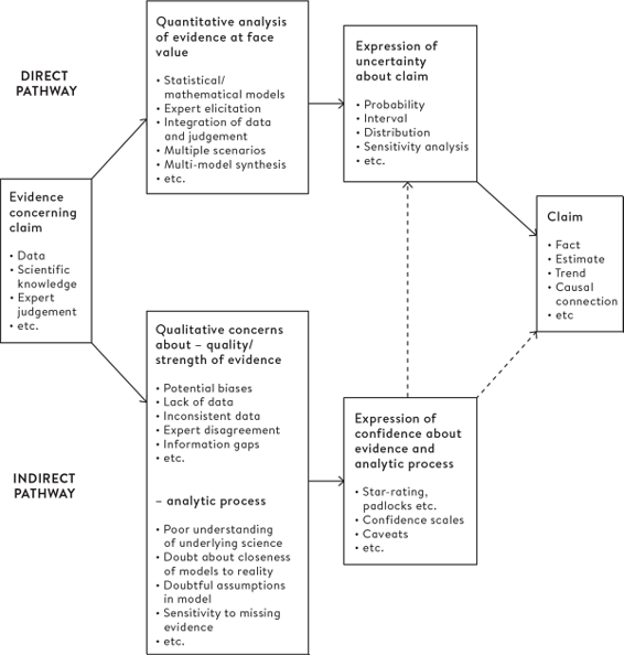 Этот пример также показывает, что, хотя научные исследования, как правило, достаточно хорошо признают неопределенность, любые рассчитанные пределы погрешности обычно слишком малы, поскольку они обусловлены тем, что все предположения статистической модели верны, а это уже стало клише, что "все модели ошибочны". Кроме того, у нас неизбежно возникает ощущение, что некоторые анализы лучше других, поскольку доказательства более весомы и понимание лучше. Многие организации, впервые появившиеся в разведывательном сообществе, сочли полезным выражать степень доверия к любому анализу, как это сделала наша команда при оценке количества людей, заразившихся гепатитом С в результате переливания инфицированной крови в Великобритании.