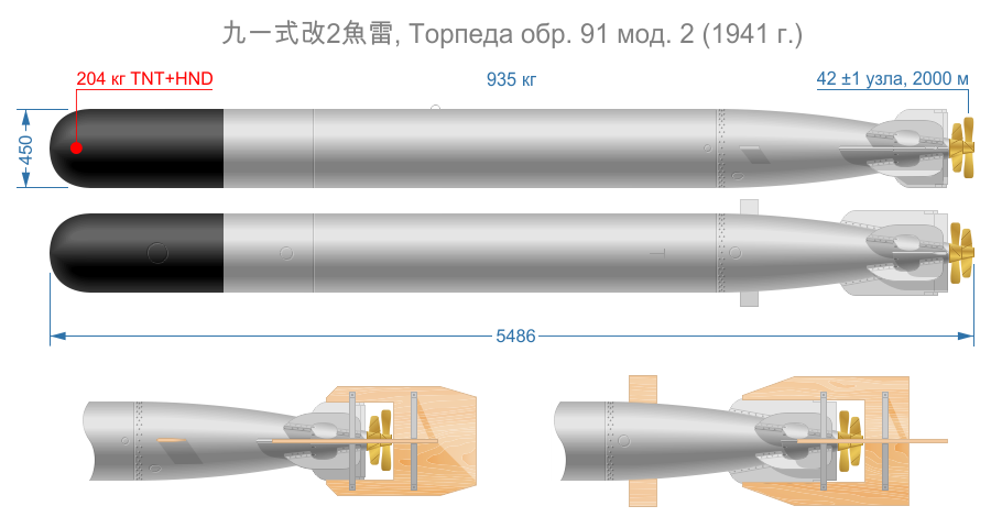 Между тем неспешная работа конструкторов из военно-морского арсенала в Йокосуке принесла, наконец, свои плоды – была создана новая модификация торпеды обр. 91. От первой версии её отличала увеличившаяся длина и облегчённый танк для сжатого воздуха, что позволило увеличить массу заряда в боевой части со 150 до 203 кг тротил-гексиловой смеси. Торпеда также получила четыре дополнительных стабилизатора, установленных под углом 45° к основным.