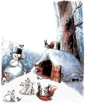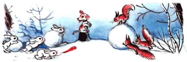 Стали зайцы Снеговика лепить, а белки — им помогать: лапками похлопывают, хвостиками обмахивают.