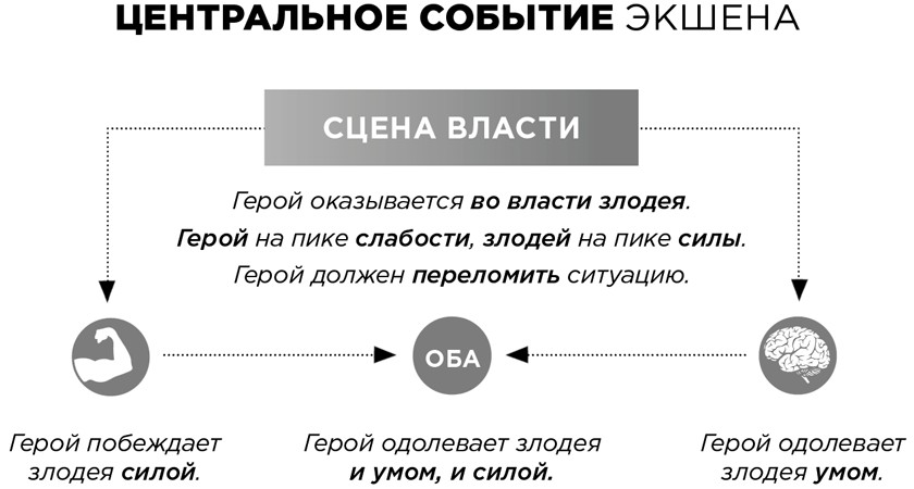 Экшен как жанр воплощает в действии ключевую метафору борьбы жизни и смерти, без которой немыслимо человечество. Экшен сводит самоотверженного героя с самовлюбленным злодеем в битве, разворачивающейся на всем протяжении повествования, чтобы сокрушить зло и спасти беспомощную жертву. Эти персонажи — герой, злодей, жертва — представляют три разнонаправленные движущие силы в любом из нас: волю к победе, стремление разрушать и надежду уцелеть.