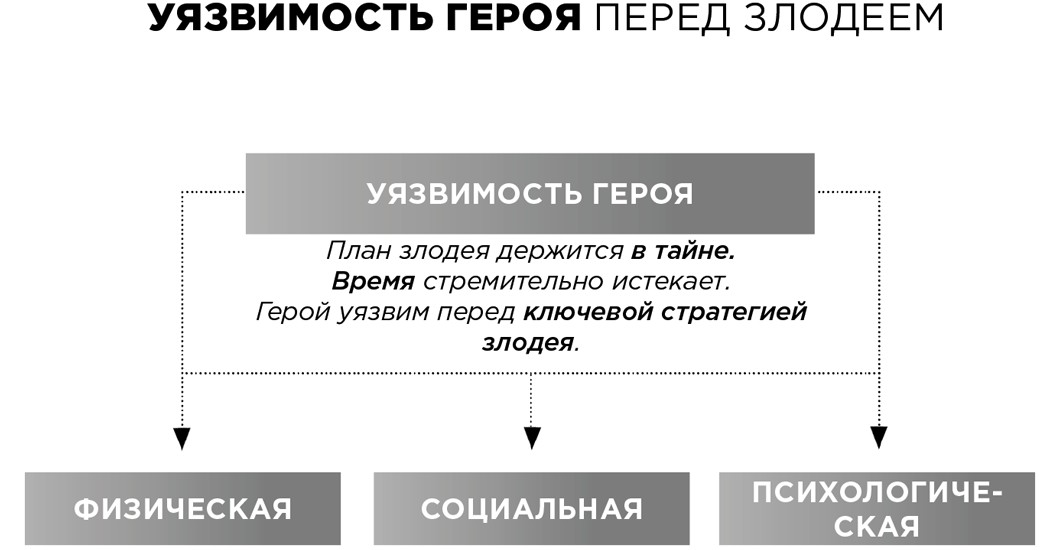 Битвы с природной стихией — огнем, потопами, землетрясениями, молниями, дикими зверями — вдохновляли рассказчиков на драматическое описание физической борьбы. Однако гораздо чаще нашей жизни в том или ином смысле угрожают люди, а не природа, поэтому параллельно складывались еще две разновидности историй — о социальных и межличностных конфликтах. На этих трех уровнях — физическом, социальном и личном — выстраиваются арки перемен во внешней жизни персонажа. Внутренние перемены происходят на скрытом от посторонних глаз частном уровне самосознания и подсознания.
