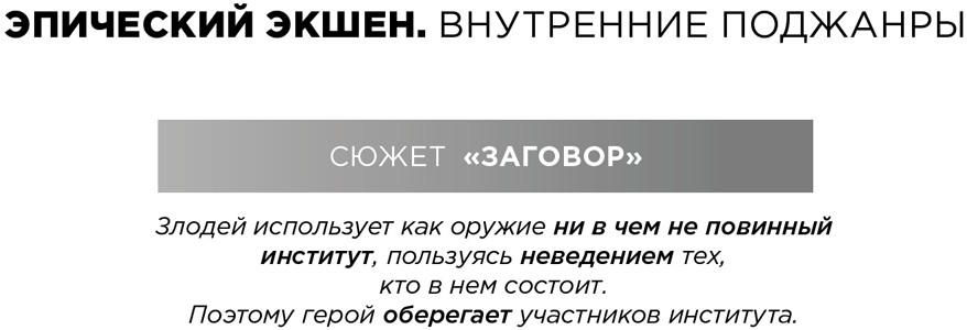 В качестве примеров во всех главах мы приводим произведения, завоевавшие популярность в свое время, но самое главное, наглядно и четко иллюстрирующие принципы и особенности жанра. Поэтому рекомендуем ознакомиться со следующими фильмами: «Крепкий орешек» (Die Hard), «Миссия невыполнима: Протокол Фантом» (Mission: Impossible — Ghost Protocol), «Терминатор» 1, 2 (Terminator I–II), «Назад в будущее» 1–3 (Back to the Future I–III), «Люди в черном» 1–3 (Men in Black I–III), сага «Звездные войны» (Star Wars), «Стражи Галактики» (Guardians of the Galaxy), «Темный рыцарь» (The Dark Knight), «Казино „Рояль“» (Casino Royale), «Матрица» (The Matrix), «Петля времени» (Looper) и «Мстители: Финал» (Avengers: Endgame).