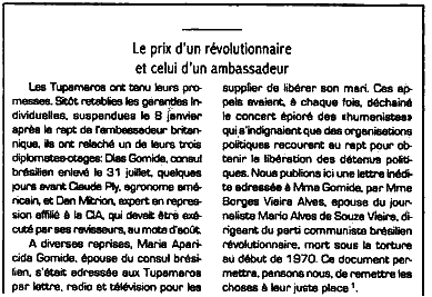 Мария Апарасида Гомиде, жена бразильского консула, многократно обращалась к тупамаро письменно, по радио и по телевидению, умоляя освободить ее мужа. Ее призывы всякий раз вызывали жалостливый хор «гуманистов», негодовавших, что политические организации прибегают к похищению, дабы добиться освобождения политзаключенных. Мы здесь приводим неопубликованное письмо, посланное сеньоре Гомиде сеньорой Борхес Виэйра Алвеш, женой журналиста Марио Алвеша де Соуса Виэйры, руководителя бразильской революционной коммунистической партии, погибшего под пытками в начале 1970 года. Этот документ, думается нам, поможет правильной оценке событий